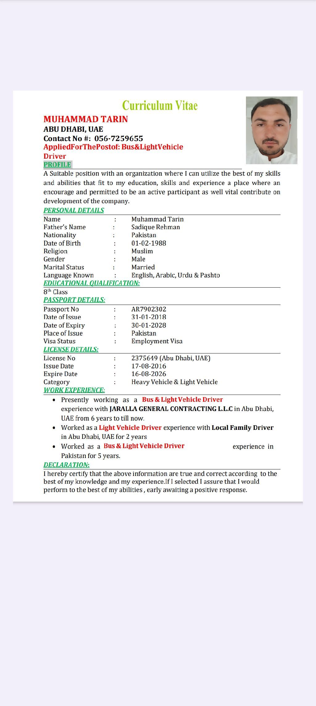 My name Muhammad tarin I need heavy bus job I have to license heavy bus and light vehicle my Experience 8 years old age 30 year You have vacancy please call me mb no thanks