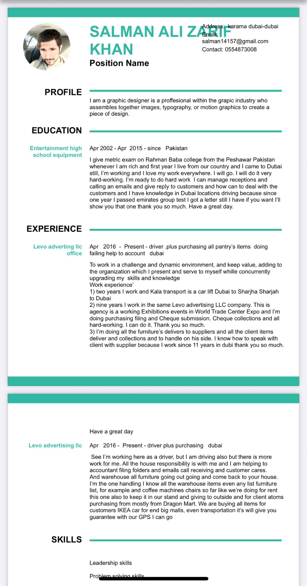 Salman Khan I am looking Driver Job. I am working here in office plus Home Driver I know all Dubai rule and regulation since 8 years. I am working. I am doing here purchasing with office accountant have for filing folder. Check submission. Check collections give service to customer or client come from hotel to airport and luxury vehicle. Also, I can drive because I already