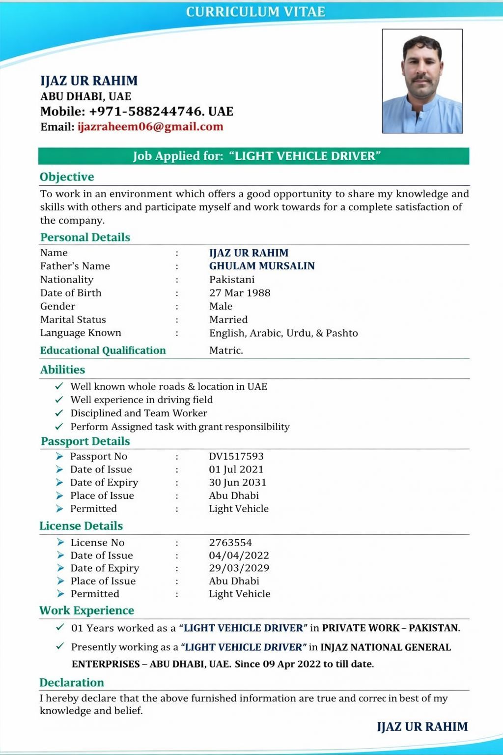 I need a job of Light vehicle driver vacancy I have a Four years experience in UAE now I am already on duty in company if you need a Driver so please tell me. so I will canceling the visa