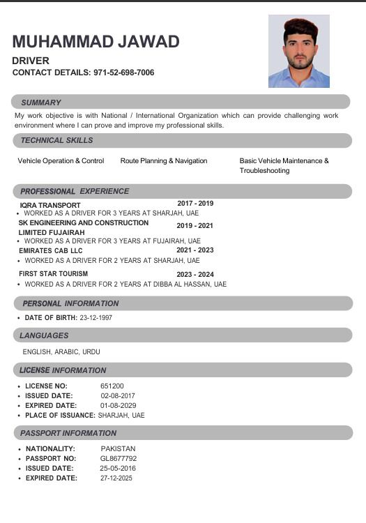 Professional driver available for full time job in Ajman or nearby areas Valid UAE license, punctual, responsible, and familiar with all major routes including Abu Dhabi Dubai Sharjah And Ajman Ready to join immediately. Kindly contact me Already cancel visa