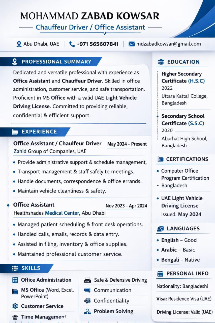 Reliable and responsible driving with 2 years experience in UAE Good knowledge of UAE roades & traffic rules. punctual. polite, and safety - focused. Able to handle long - distance driving and timely deliveries