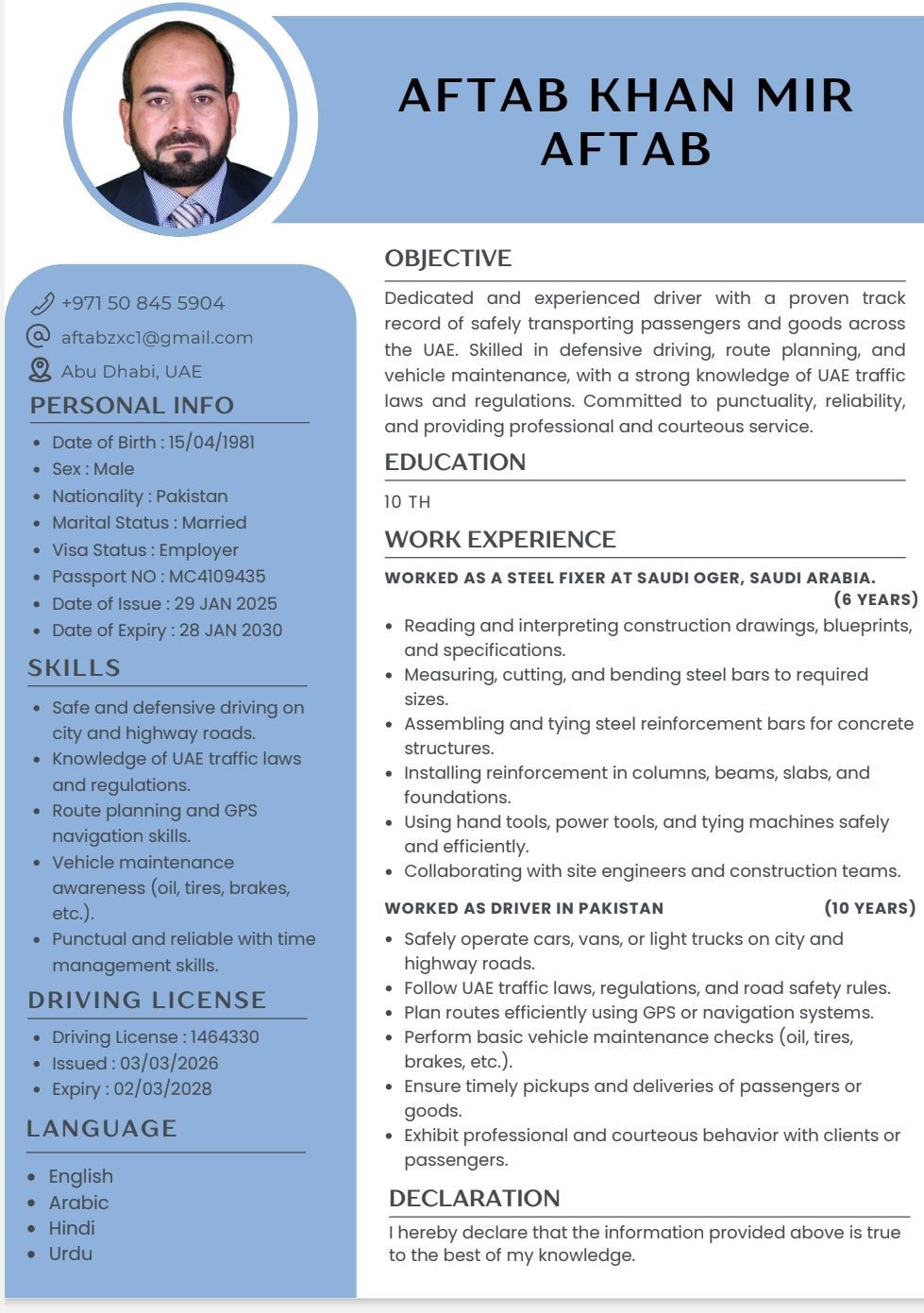 Experienced and reliable LTV License holder driver with a strong commitment to safety and punctuality. skilled in vehicle maintenance, navigation using Google experience. Dedicated to following all traffic rules and ensuring passenger safety at all times