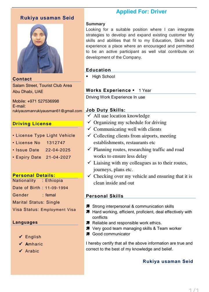 Hello everyone I am looking driving job my name is Rukiya Usman I am from Ethiopia I am living in Shamkhah I have 1 years experience Justin I am driving now contact