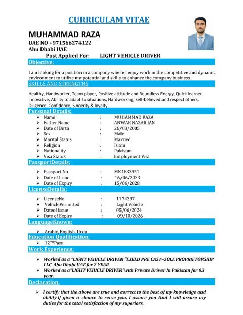 اسمي محمد رضا، ابحث عن وظيفة سائق مركبة خفيفة. لدي خبرة سنتين في الامارات العربية المتحدة