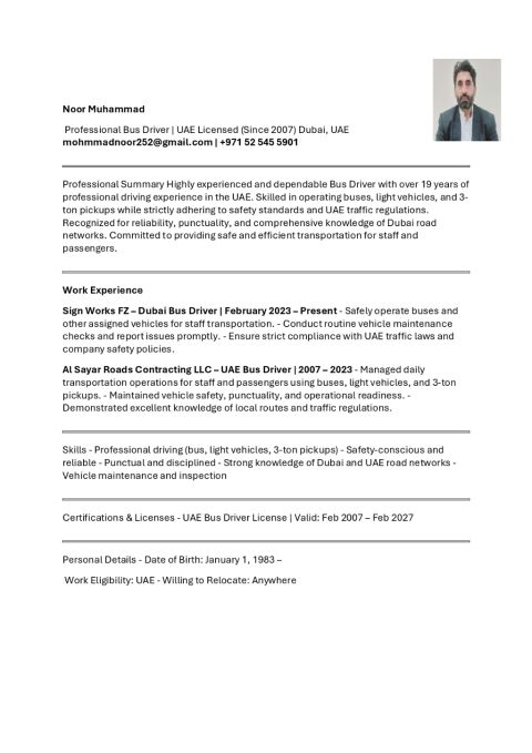 أنا الله نور من باكستان ابحث عن وظيفة سائق. لدي 16 سنة من الخبرة في أبوظبي سائق حافلة ثقيلة
