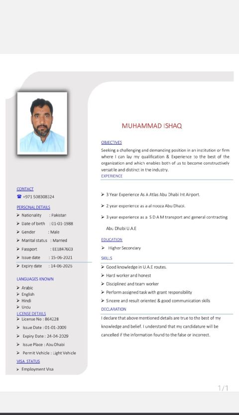 Pakistani driver, looking for wark, 8 years experience in the Emirates, license in manual, All, location, I know, language, English, Urdu, Arabic, Hindi
