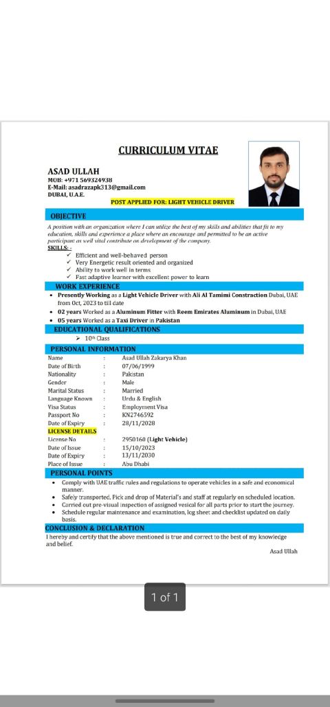 My name is Asad ullah I am looking for the driver job in UAE 2 + year experience in UAE