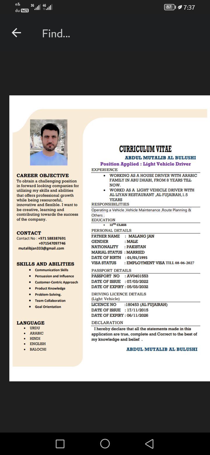 My name is Abdul Mutalib. AlBaloshi. im. 30. years. old. im from Balochistan. am. looking for a Driver job. I have a every experience. with a family driver. I have miul. lession. experience in Abu Dhabi. fumarate. RAK. IM. Speak. Arabic. Urdu. HINDI. ND M I have a 9 years'experience in Abu Dhabi. Good blessing