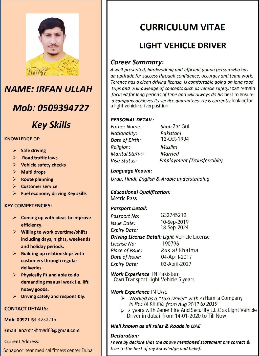 9 years experience in driving in UAE speaking English Arabic Urdu also gym trainer fit