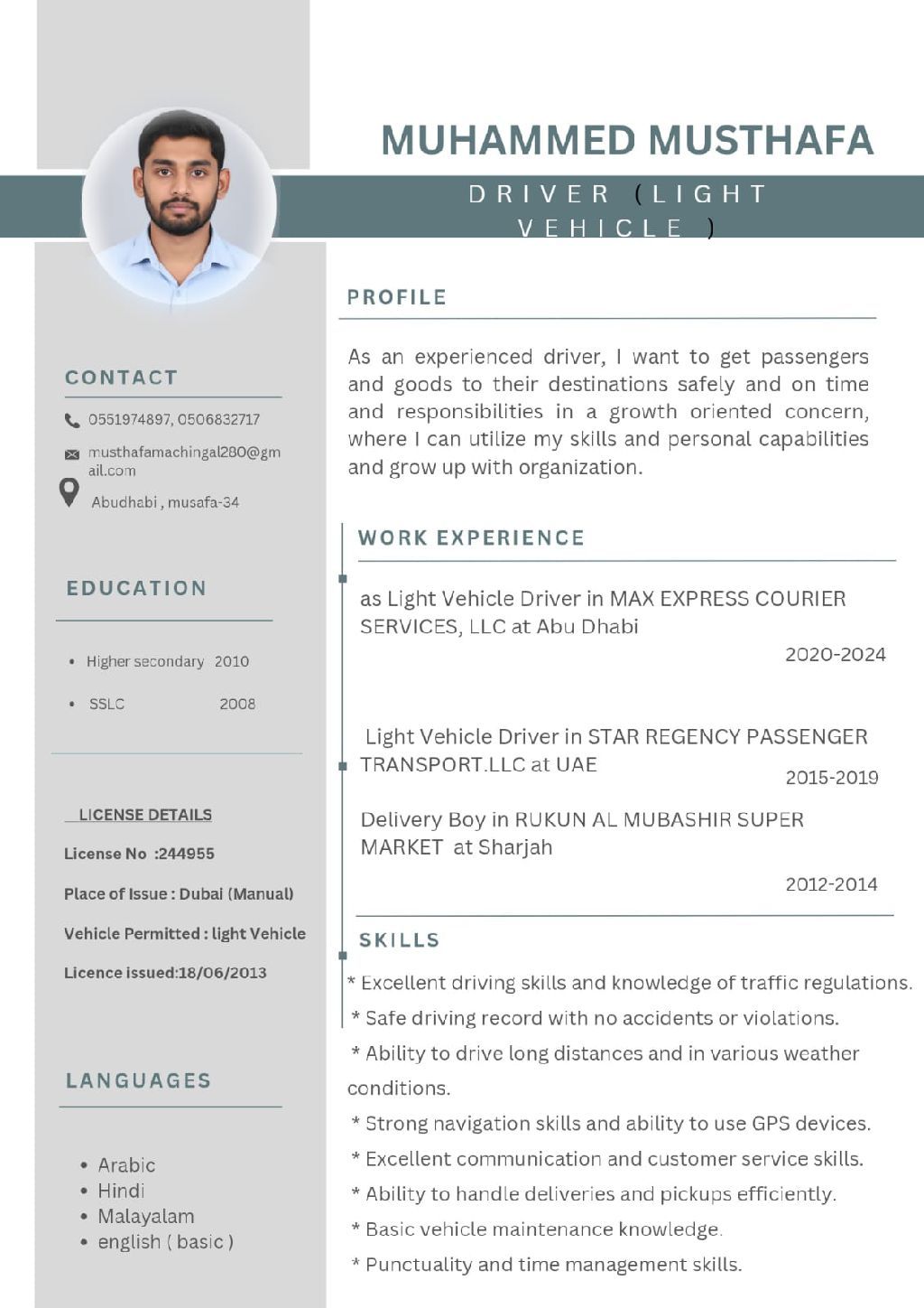 I am Muhammed Musthafa from India Kerala Now available in Abu Dhabi (visit visa) I am looking for driver Job 12 years experience in Abu Dhabi I am worked in company driver before please any job available contact me