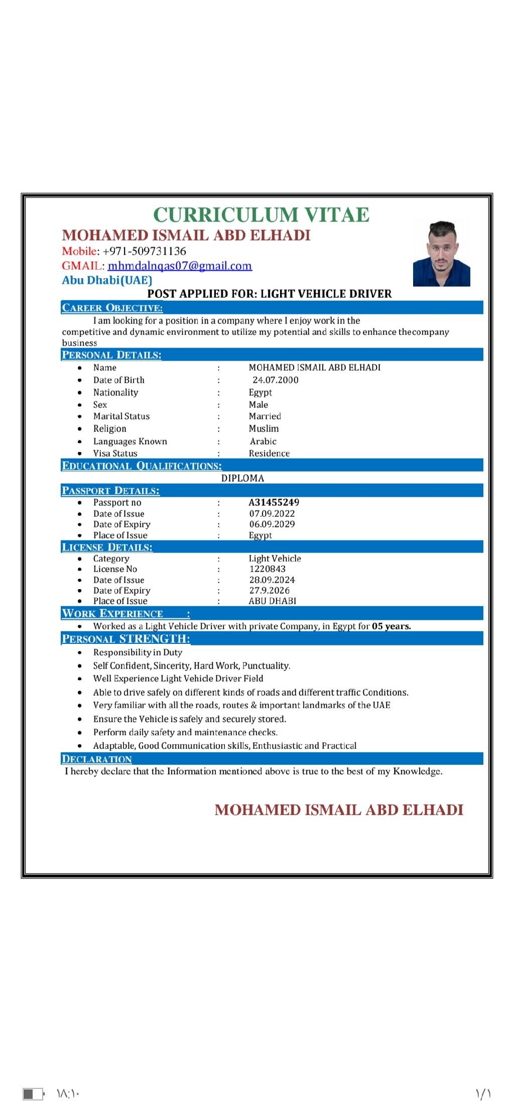 أنا محمد اسماعيل من مصر مقيم في دولة الامارات ابحث عن عمل معيا ليسن خفيف العمر 25 سنة