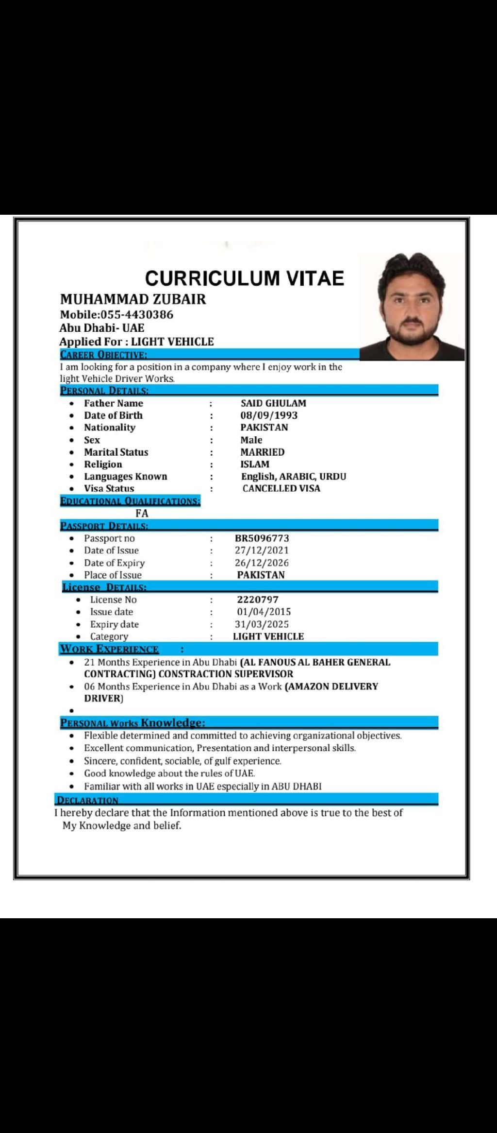 I am Muhammad Zubair khan from Pakistan and live in Abu Dhabi Mussafah 14 years old license
