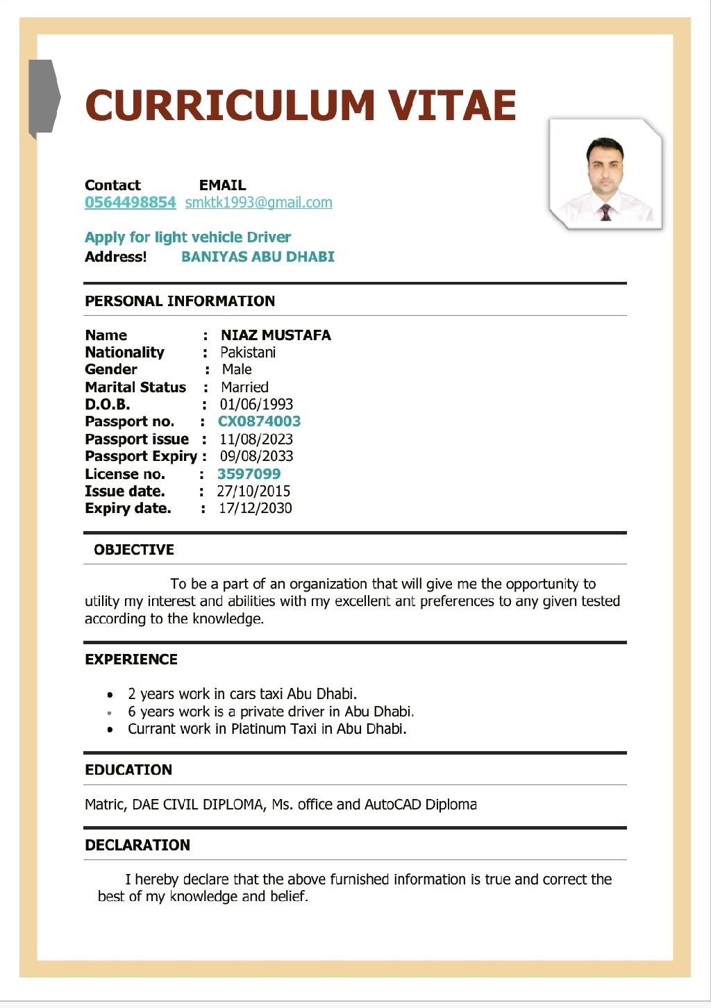 I have 10 years driving experience in Abu Dhabi. Currently working in platinum Taxi in Abu Dhabi