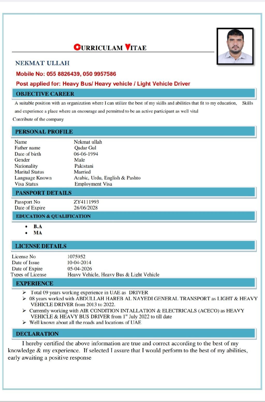 My name is NEKMAT ULLAH I am from Pakistan. But now I am in UAE I have three license light vehicle license heavy vehicle license and heavy bus license and I have more than 12 years experience in UAE as a driving. I know all the roads and routes in UAE I also know English Arabic Urdu and Pashto in writing reading and speaking. I have already cancel my visa I am ready for immediately joining