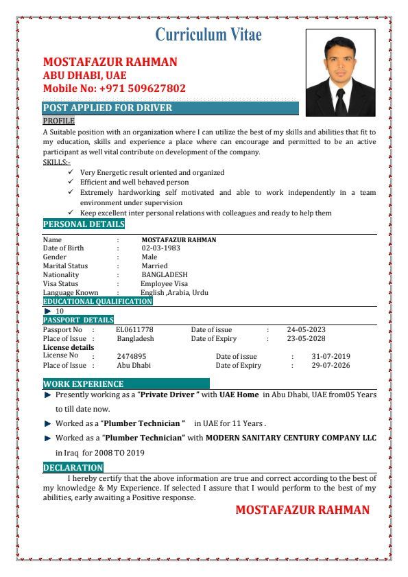 I am looking house driver job. I have 6 year work experience house driver. Before I was working Abu Dhabi Khalifa City area. I am interested to work with European family. I can speak English and Arabic. I have good knowledge about UAE traffic rolls. also I am plumber technician