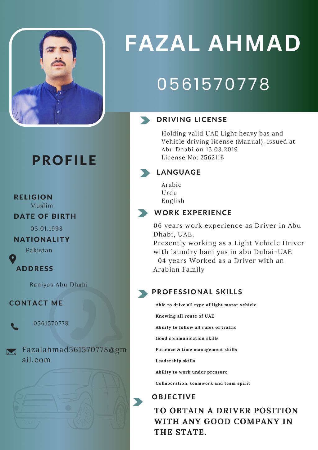 My name is Fazal Ahmad. I am from Pakistan and currently hold my own visa. I have 6 years of driving experience and a good understanding of UAE traffic rules and regulations. I am familiar with using Google Maps and navigation systems. I am currently looking for a driving job. If anyone is in need of a reliable and experienced driver, please feel free to contact me