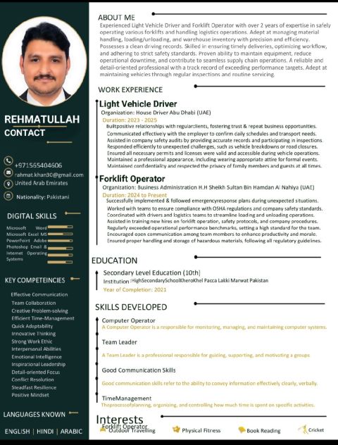 I am ZULFIQAR UDDIN from Pakistan I am speaking English Arabic Urdu I am looking for a driver's job Manual license I have 10 years of driving experience in the UAE. 2 Year experience house driver and 2 Year experience taxi driver and 5 Year experience Emirates transport. anyone needs driver so please contact me my number. thanks and best regards