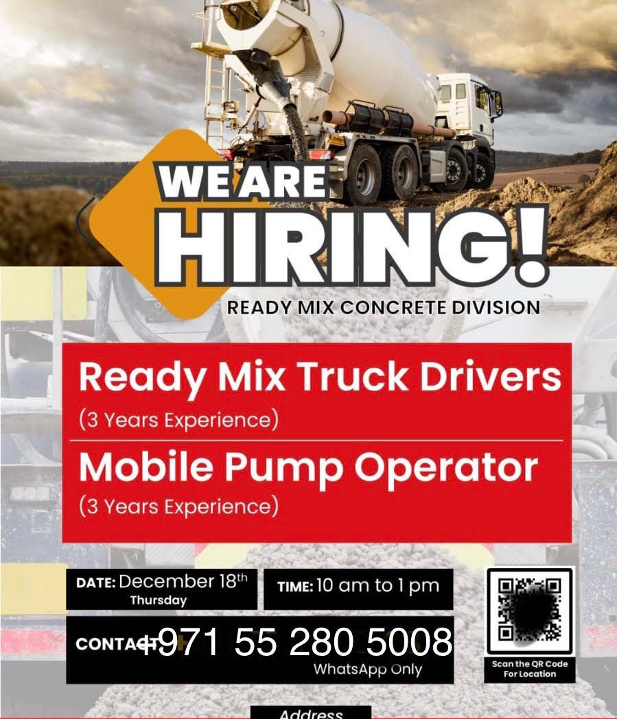 مطلوب سائقين خلاطة خرسانة وسائقين مشغلين مضخات خرسانة (بمبات) نقل ثقيل في أبوظبي - كيزاد ب برواتب وعمولات مجزية بدل تريب (15 - AED20) والبمب عالمتر (1.5 - AED2)