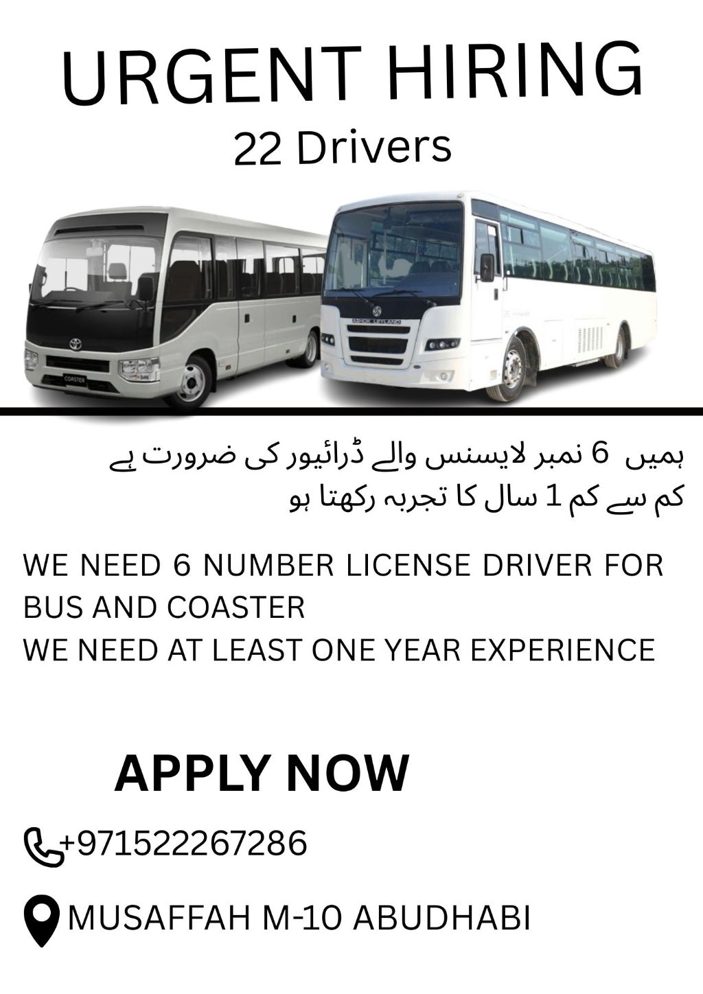 We are looking for 22 experienced Bus Drivers with the following requirements Minimum 1 year of driving experience Fluent in Pashto, Urdu, and Hindi Salary will be depend upon experience. Valid driving license Visa will also be provided or own visa can also If you meet the above criteria, please contact us conscious Mussafah M 10