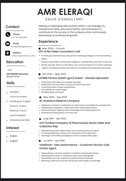 أنا عمرو العراقي، ابحث عن وظيفة مبيعات في مدينة العين لدي خبرة طويله في مجال المبيعات في الدولة وتحقيق التارجت بجداره وسهولة والتعامل مع العملاء وحل المشكلات أيضا