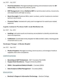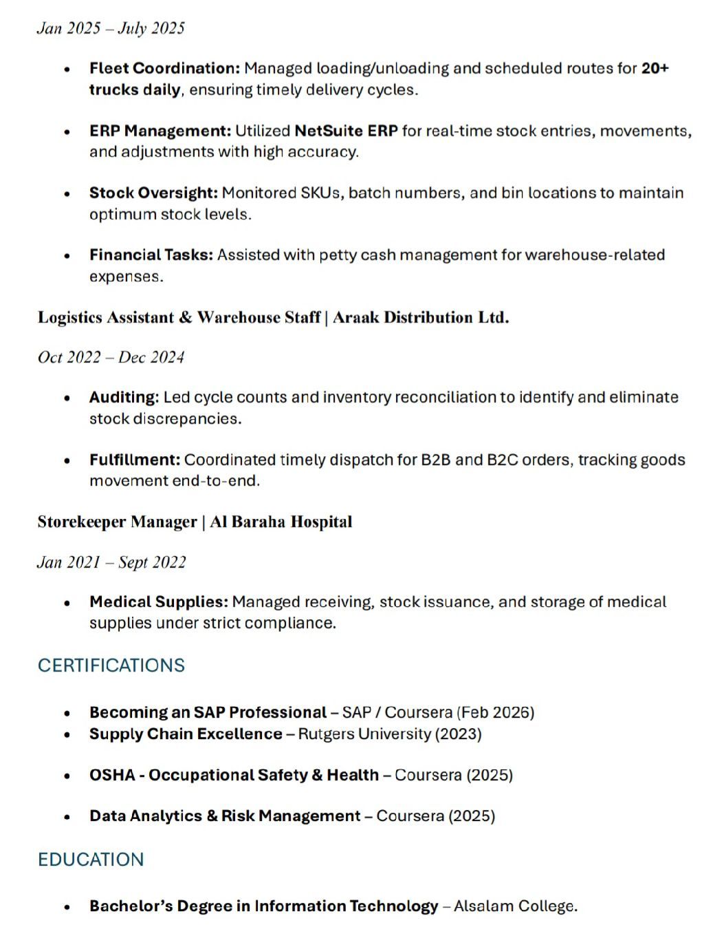 Dear hiring manager I am writing to express my interest in the Warehouse/ Storekeeper position. I have strong experience in inventory control, receiving, dispatching, stock arrangement, and using ERP systems. I am organized, reliable, and able to work under pressure with accuracy and speed. I am currently available in the UAE and ready to join immediately. Thank you for your consideration. Kind