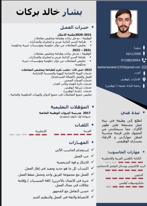 شاب عربي من الجنسية المصرية خلوق وملتزم يحترم وقت العمل بشدة يبحث عن أي وظيفة لديه خبرات في عدة مجالات في الدولة وعنده شهادة بكالوريوس محاسبة ونظم معلومات للتواصل
