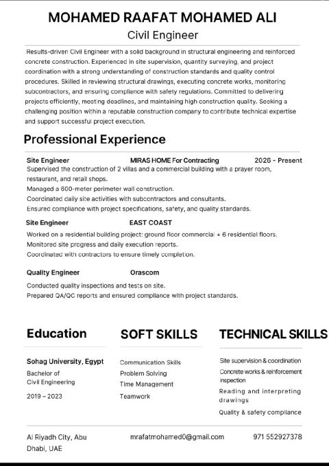 مهندس مدني بخبرة 3 سنوات داخل الدولة في الاشراف على تنفيذ المشاريع السكنية والتجارية، وإدارة أعمال الموقع والتنسيق مع المقاولين لضمان الجودة والالتزام بالجدول الزمني، مع خبرة في أعمال الخرسانة وضبط الجودة