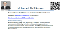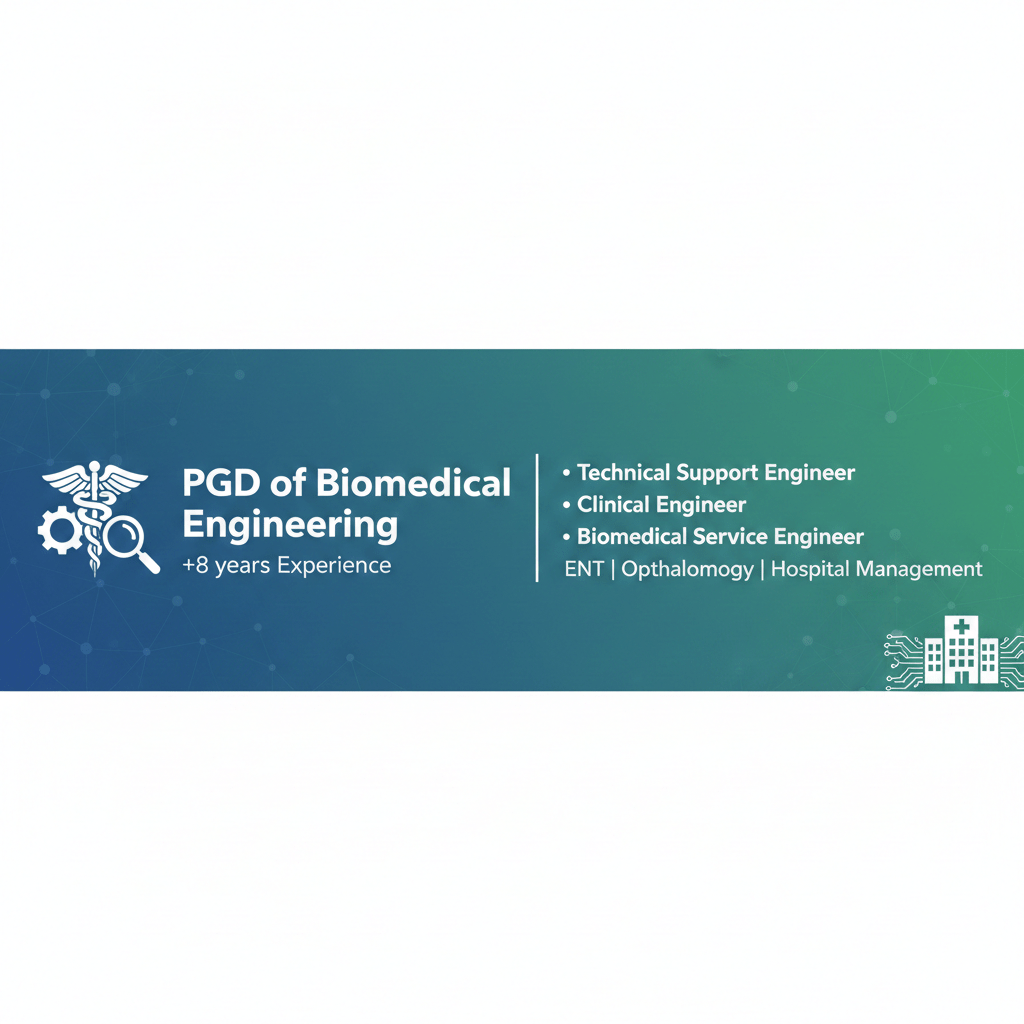 مهندس اجهزة طبية (Biomedical Engineer) مقيم في الرياض، امتلك خبرة واسعة تزيد عن 8 سنوات في تركيب وصيانة وتطوير أداء الاجهزة الطبية، متخصص بشكل احترافي في اجهزة العيون (Ophthalmology) واجهزة السمع والتوازن (Audio - Vestibular) جاهز لنقل الكفالة والعمل بأي مكان بالمملكة. أبرز المؤهلات والخبرات الاعتماد حاصل على اعتماد الهيئة السعودية للمهندسين ولديك رخصة قيادة سعودية سارية. الخبرة العملية العمل لدى
