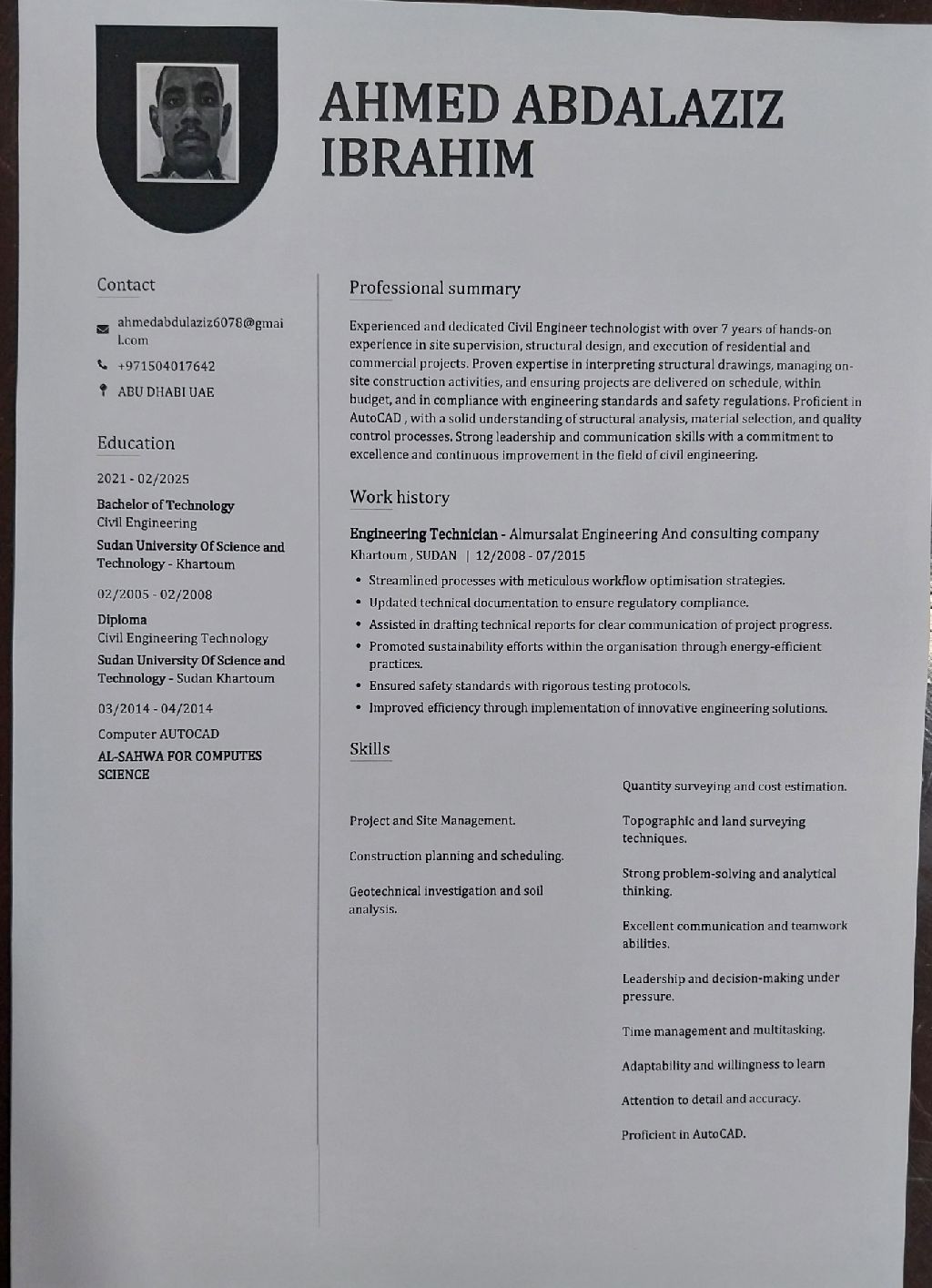 مهندس مدني خربج 2025 معي رخصة وإقامة سارية