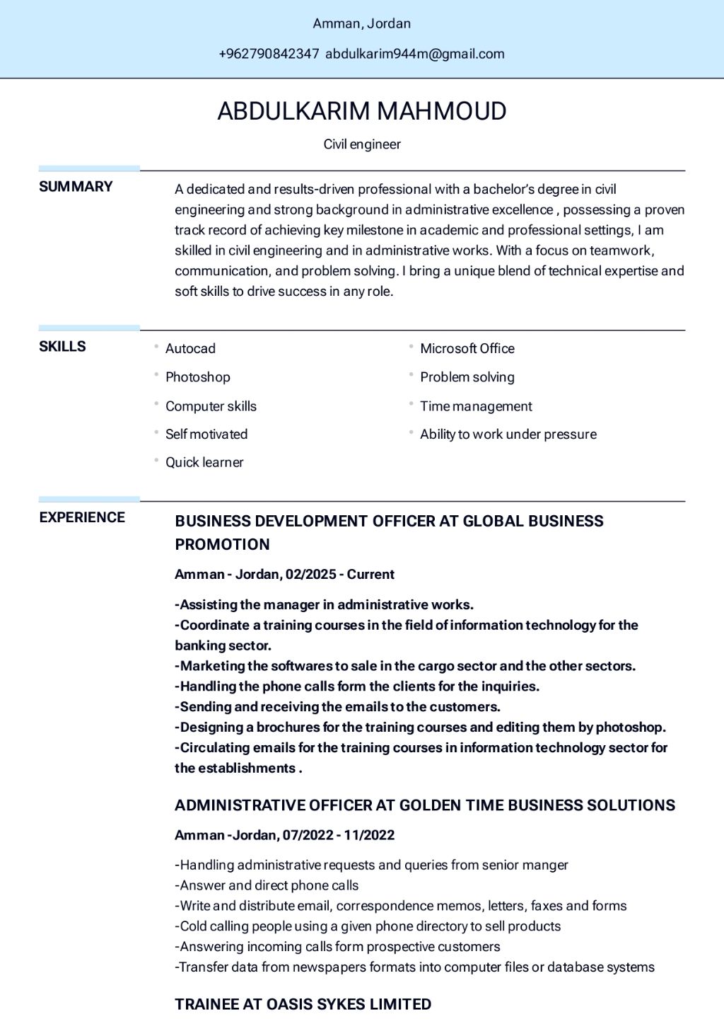 مهندس مدني خريج 2019 من الأردن ابحث عن عمل بشركة مقاولات مرموقة أو شركات أو مكاتب هندسية في أبوظبي أو دبي أو الشارقة خبرة سنة ونصف في الأعمال الادارية 6 أشهر كمدخل بيانات في العطاءات والمناقصات وسنة مطور أعمال في شركة تكنولوجيا المعلومات عندي مهارة أستخدم الكمبيوتر مثل برامج الاوتوكاد والمايكروسوفت أوفيس والفوتوشوب أنا حاليا في الأردن