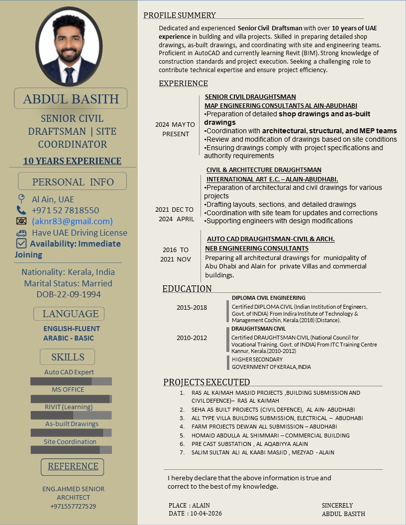I am a Senior Civil Draftsman with 10 years UAE experience in building and villa projects, including site coordination. I am currently available and can join immediately. Kindly let me know if there is any suitable vacancy