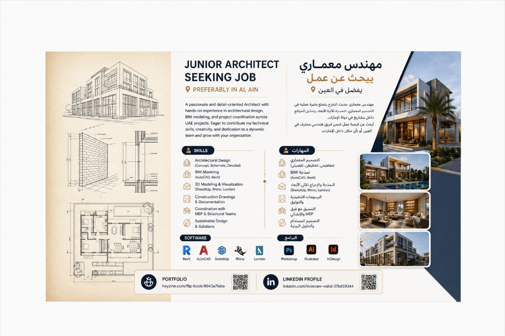 مهندس معماري متميز متاح فورا للعمل مهندس معماري خريج جامعة أبوظبي بمعدل مرتفع (3.91 / 4) متخصص في التصميم المعماري الحديث والمستدام، مع مهارات متقدمة في النمذجة ثلاثية الأبعاد والاخراج المعماري الاحترافي. امتلك القدرة على تحويل الأفكار الى تصاميم واقعية عالية الجودة، والعمل ضمن فرق متعددة التخصصات لتقديم حلول تصميم مبتكرة وعملية. ابحث عن فرصة عمل في مكاتب استشارات هندسية شركات تطوير عقاري شركات تصميم