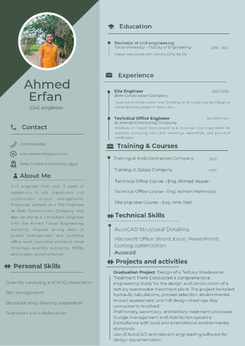 In the position of a site and technical office civil engineer. I am confident that my experience in execution and supervision, my keen interest in quality, my project management skills, along with my strong commitment to safety standards, align well with the job requirements. Additionally, my experience in the technical office field, structural shop drawin