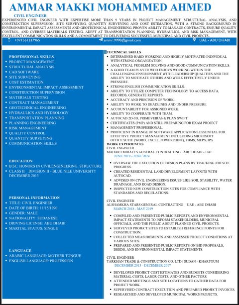 Civil engineer with over 10 years of experience in contracting, specializing in quantity surveying and actual cost estimation, certified by Abu Dhabi Municipality, with thorough knowledge of government regulations, First Abu Dhabi Bank procedures, and proficiency in using Tamm, MEPS, and IPs. Seeking a suitable job opportunity