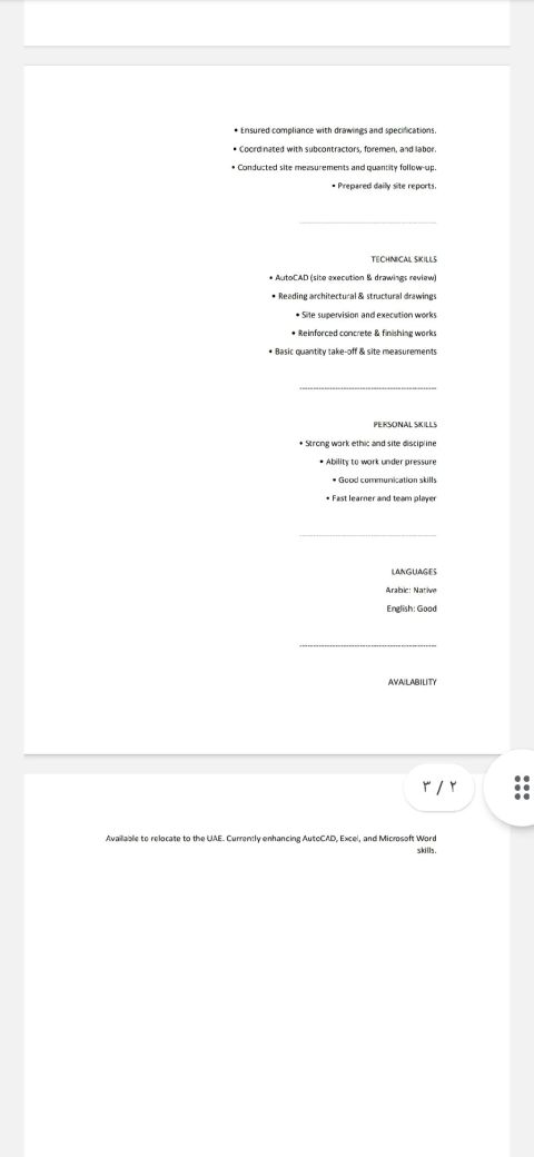 مهندس مدني خبرة أربع سنوات تنفيذ واشراف لمشاريع السكنية حساب الكميات داخل مدينة أبو ظبي
