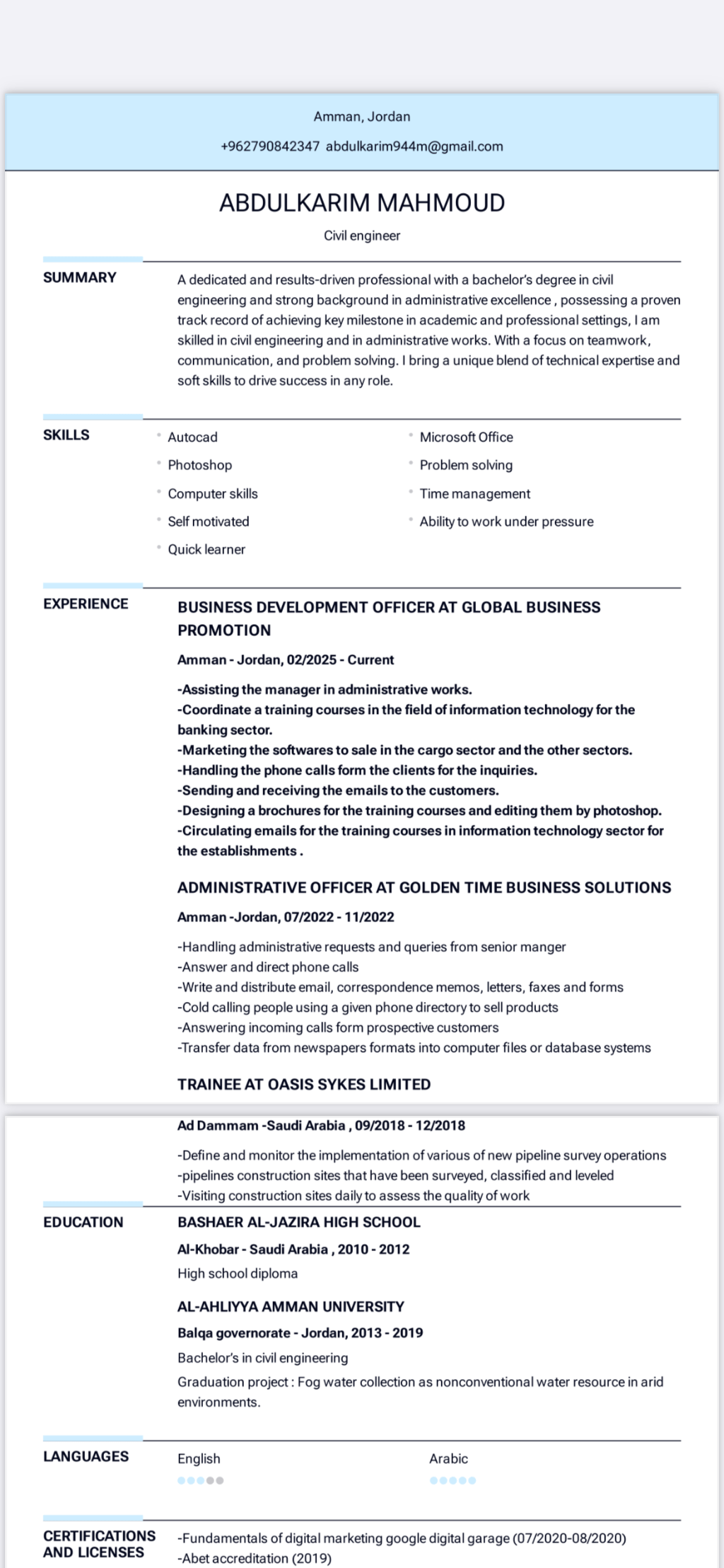 مهندس مدني خريج 2019 من الأردن ابحث عن عمل بشركة مقاولات مرموقة أو شركات أو مكاتب هندسية في أبوظبي أو دبي أو الشارقة خبرة سنة ونصف في الأعمال الادارية 6 أشهر كمدخل بيانات في العطاءات والمناقصات وسنة مطور أعمال في شركة تكنولوجيا المعلومات عندي مهارة أستخدم الكمبيوتر مثل برامج الاوتوكاد والمايكروسوفت أوفيس والفوتوشوب أنا حاليا في الأردن