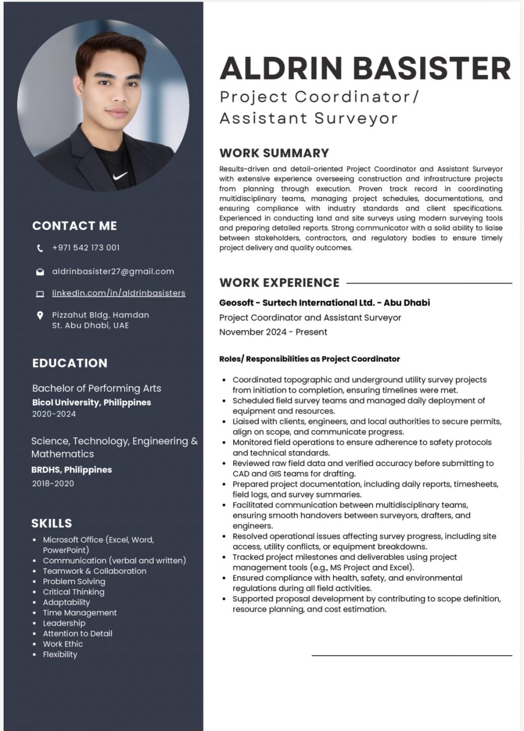 Greetings I am Aldrin Basister looking for new opportunity, I graduated with bachelors degree and with an experience here in UAE (Oil & Gas field Engineering Company) I am very hardworking, dedicated to work, flexible, adaptable and responsible