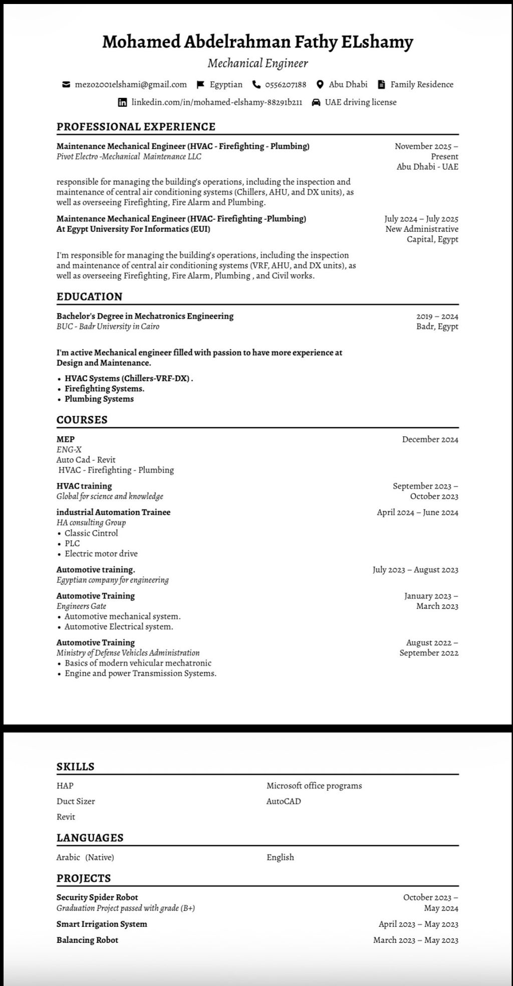 Egyptian mechanical engineer have 2 years family visa and driving license based in Abu Dhabi graduated 2024