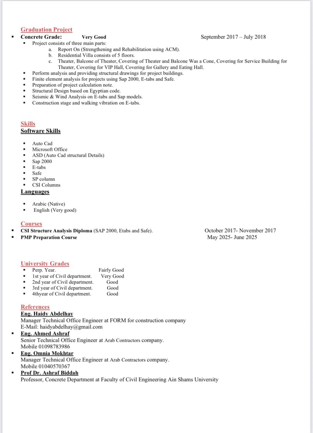 I am Mahmoud Ashraf a Civil Engineer with 7 + years of experience in technical office and site engineering roles across major infrastructure and commercial renovation projects. Skilled in quantity surveying, shop drawings, client invoicing, and structural analysis using software such as AutoCAD, ASD, MO Proven ability to coordinate with clients, consultants, and subcontractors under tight deadline