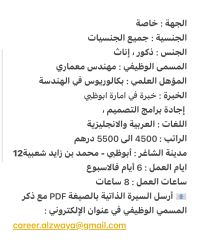 مطلوب مهندس معماري خبرة في امارة أبوظبي اجادة تامة في جميع برامج التصميم للعمل لدى مكتب استشارات هندسية مدينة محمد بن زايد - أبوظبي