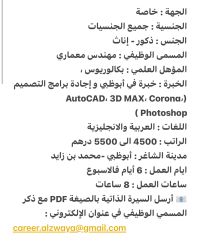 مطلوب (مهندس معماري) لمكتب استشارات هندسية - أبوظبي مدينة محمد بن زايد شعبية 12 خبرة في أبوظبي واجادة برامج التصميم (AutoCAD، 3ds Max Corona، Photoshop) يرجى ارسال CV على الايميل لمن لديه الشروط