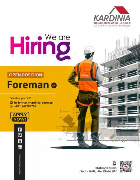 شركة Kardinia Alshaam Decor Work مطلوب فورمان مواقع لديه خبرة قوية في أعمال الأسقف المستعارة وإدارة مواقع التنفيذ. المهام والمتطلبات خبرة عملية في الأسقف المستعارة وأعمال الديكور. القدرة على إدارة المواقع واستلام الأعمال. انهاء جميع الامور الورقية والتقارير الخاصة بالموقع. الحفاظ على سير العمل وضمان الانجاز السريع والجودة العالية. القدرة على حل المشكلات