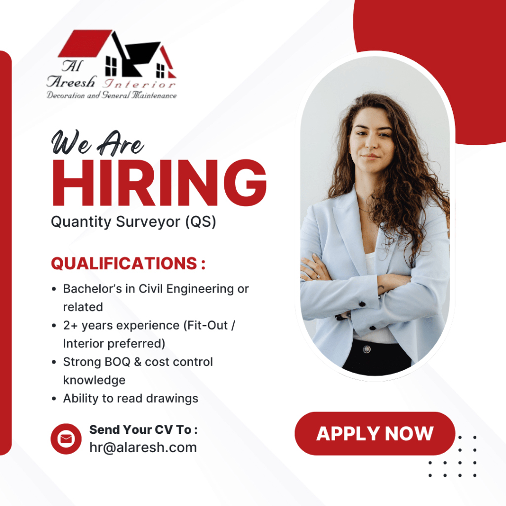 Quantity Surveyor (QS) Requirements Bachelor’s degree in Civil Engineering or a related field, minimum 2 years of experience in fit - out and interior works in Al Dana area, Abu Dhabi city, strong knowledge of BOQs and cost control, and the ability to read drawings. Send CV