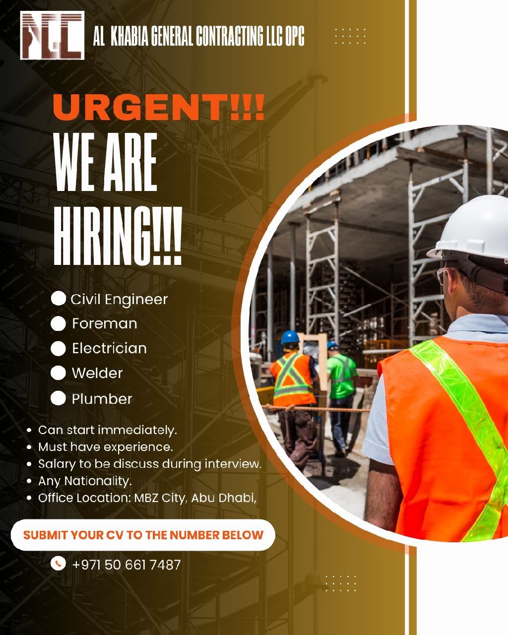 We are looking for Experienced and Highly Skilled Civil Engineer, our Office location is at Mohamed Bin Zayed City, Abu Dhabi. Submit your CV now via email or mobile number given