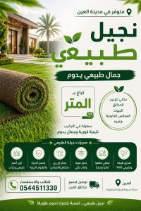 نجيل طبيعي عالي الجودة - متوفر في مدينة العين حول حديقتك الى مساحة خضراء جذابة بأفضل أنواع النجيل الطبيعي بيع بالمتر مناسب للحدائق، الفلل، الاستراحات، والمجالس الخارجية تركيب سريع ونتيجة فورية يتحمل حرارة الجو في الامارات مظهر أنيق وطبيعي 100% توصيل لجميع مناطق العين للطلب والاستفسار نجيل طبيعي لمسة خضراء تدوم طويلا