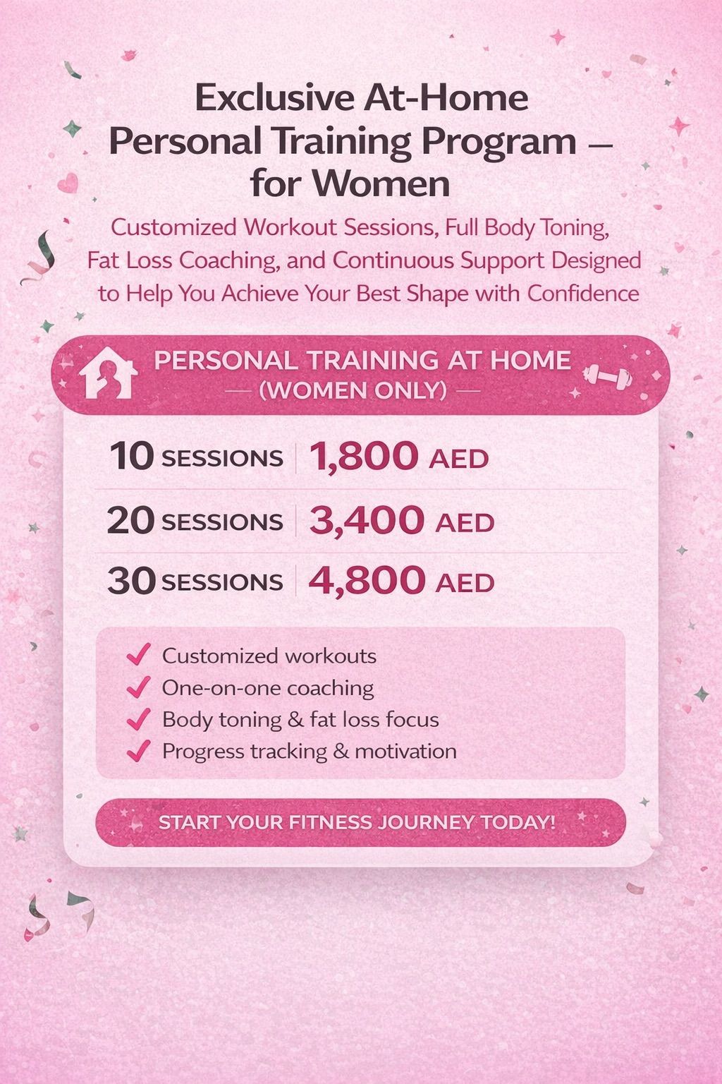 Professional in - home personal training designed to help you improve fitness, burn fat, tone your body, and build strength safely and effectively. Customized workout sessions based on your goals and fitness level, with continuous guidance and motivation to achieve real results. A flexible home training service in Abu Dhabi that fits your lifestyle and offers comfort and privacy