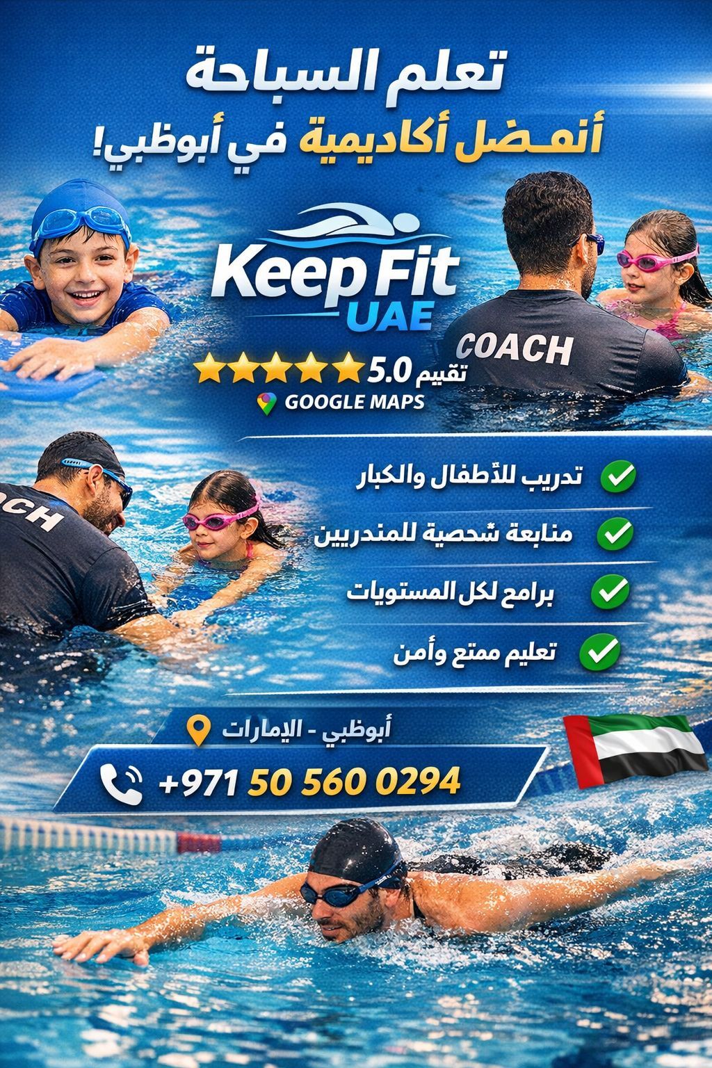 Certified Swimming Coach & PE Teacher Services Beginners Juniors Adult Aqua Fitness Competition & School Test Prep. Private Lessons At your Villa or Club. Areas Abu Dhabi, Baniyas, Al Shamkha, MBZ, Khalifa A Flexible Sessions AM/ PM. Book Now (Call