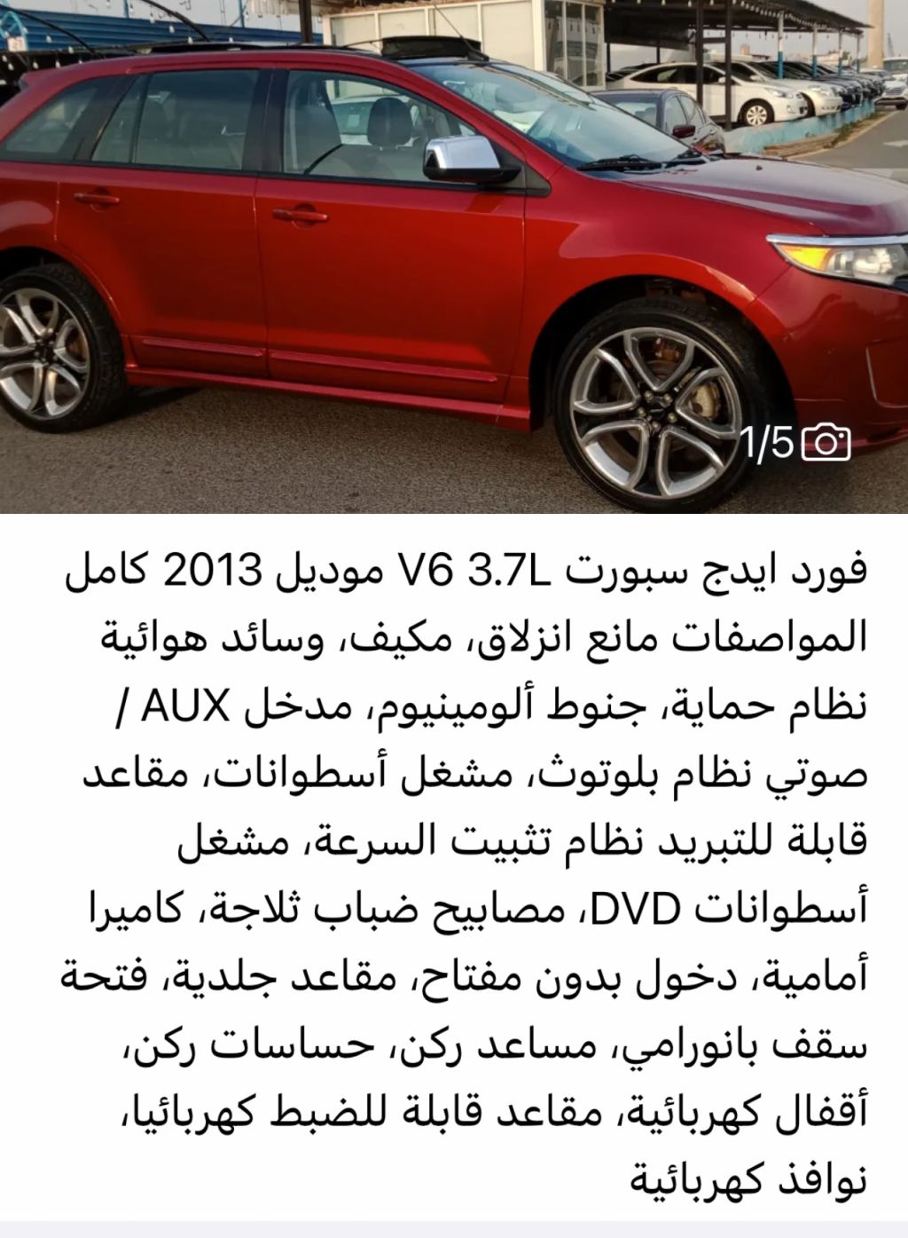مالك أول فورد إيدج سبورت V6 3.7L موديل 2013 كامل المواصفات: مانع انزلاق، مكيف، وسائد هوائية، نظام حماية، جنوط ألومينيوم، مدخل AUX صوتي، نظام بلوتوث، مشغل أسطوانات، مقاعد قابلة للتبريد، نظام تثبيت السرعة، مشغل أسطوانات DVD، مصابيح ضباب، ثلاجة، كاميرا أمامية، دخول بدون مفتاح، مقاعد جلدية، فتحة سقف بانورامي، مساعد ركن، حساسات ركن، أقفال كهربائية، مقاعد قابلة للضبط كهربائياً، بدون حوادث، صبغ وكالة