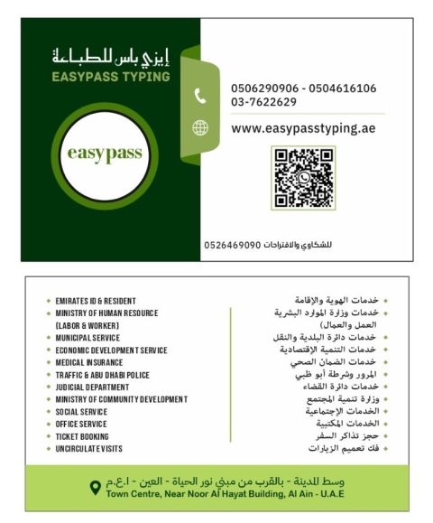 مكتب الحصيات خبرة تكتر من 30 سنة في تخليص المعاملات وتأسيس الشركات في الامارات والاسترحامات وسداد الغرامات وتجديد الهوية والإقامة والهوية واضافة عمالة منزلية والغاء وتعميم والغاء تعميم وكل معاملات الجوازات والبلدية والاقتصادية واتحاد الماء والكهرباء تقديم كافة الجمعيات الخيريه