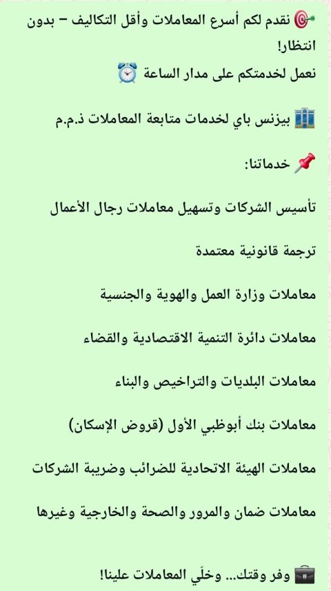 توفير خدمات تخليص المعاملات تأسيس الشركات توفير وكيل خدمات الطباعة والمرور ودائرة التنمية الاقتصادية والضمان الصحي كافة المعاملات الحكومية والترجمة القانونية خدمة مندوب علاقات عامة لكافة المعاملات مناديب خبرة وكفاءة طويلة تعاقد شهرية تبدأ من 750 درهم للشركات